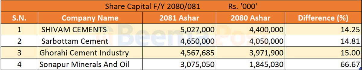 साथै, घोराहीको चुक्तापुँजी १५ प्रतिशतले बढेर ४ अर्ब ५६ करोड ७६ लाख रुपैयाँ र सोनापुरको ६६.६७ प्रतिशतले बढेर ३ अर्ब ७ करोड ५० लाख रुपैयाँ रहेको छ ।