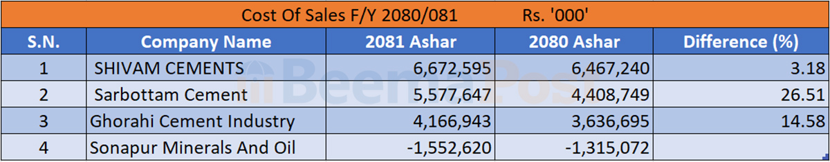 यता, बिक्री लागत सर्वोत्तम सिमेन्ट २६.५१ प्रतिशतले बढेर ५ अर्ब ५७ करोड ७६ लाख ४७ हजार रुपैयाँ, घोराही सिमेन्टको १४ प्रतिशतले बढेर ४ अर्ब १६ करोड ६९ लाख रुपैयाँ रहेको छ । सोनापुरको बिक्री लागत १ अर्ब ५५ करोड २६ लाख रुपैयाँ ऋणात्मक रहेको छ ।