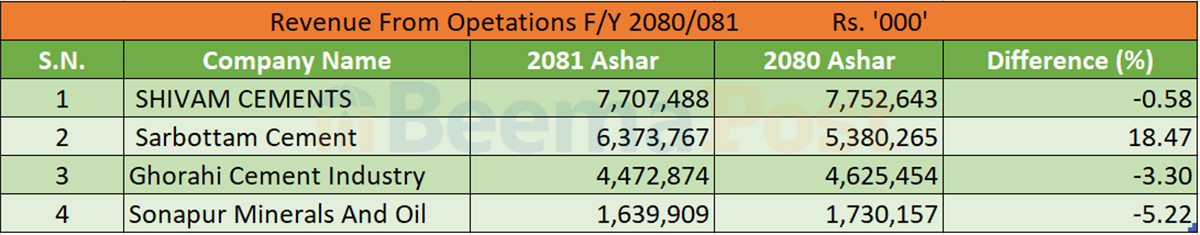 साथै, संचालन आम्दानी सर्वोत्तम सिमेन्टको १८.४७ प्रतिशतले बढेर ६ अर्ब ३७ करोड रुपैयाँ, घोराही सिमेन्टको ३.३० प्रतिशतले घटेर ४ अर्ब ४७ करोड रुपैयाँ र सोनापुरको ५.२२ प्रतिशतले घटेर १ अर्ब ६३ करोड रुपैयाँ रहेको छ ।