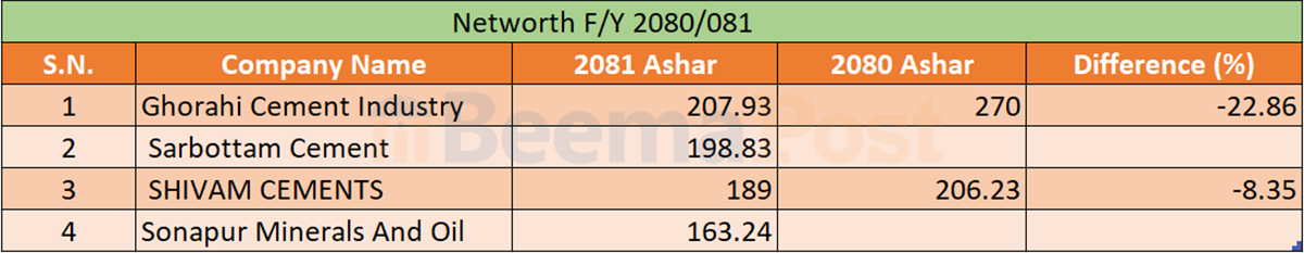 नेप्सेमा सूचीकृत चार सिमेन्ट मध्ये सबैभन्दा धेरै प्रतिशेयर नेटवर्थ २०७ रुपैयाँ ९३ पैसा रहेको छ । सर्वोत्तम सिमेन्टको प्रतिशेयर नेटवर्थ १९८.८३ रुपैयाँ रहेको हो ।