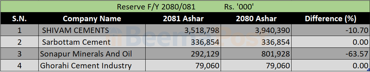 साथै, सर्वोत्तम सिमेन्टको जगेडा कोष सञ्चिति ३३ करोड ६८ लाख रुपैयाँ, सोनापुरको २९ करोड २१ लाख रुपैयाँ र घोराही सिमेन्टको ७ करोड ९० लाख रुपैयाँ रहेको छ ।