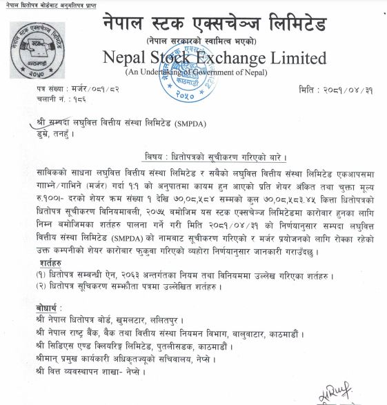 साविकको साधना लघुवित्त वित्तीय संस्था र सबैको लघुवित्त वित्तीय संस्था एकाआपसमा मर्जरभएपछि दुवै कम्पनीको शेयर सम्पदा लघुवित्तको नाममा नेप्सेमा ७० लाख ८ हजार ५८३.४५ कित्ता सूचीकृत भएको हो । योसँगै नेप्सेले यसअघि मर्जर प्रयोजनका लागि रोक्का गरेको कम्पनीको शेयर कारोबार पनि फुकुवा गरेको छ ।