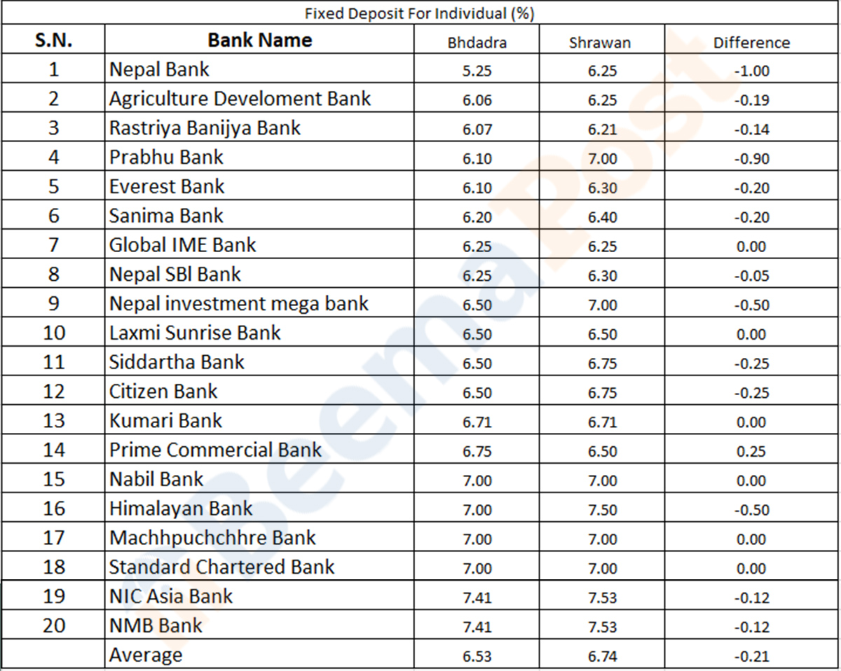 औसतमा व्यक्तिगत तर्फ मुद्दति निक्षेपको ब्याजदर ६.५३ प्रतिशत कायम भएको छ । साउनमा औसत ब्याजदर ६.७४ प्रतिशत छ । औसतको ब्याजदर भदौका लागि ०.२१ विन्दुले घटेको हो ।