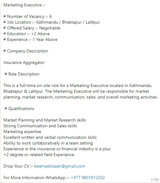 काठमाडौं । बीमा दोकानले काठमाडौं, भक्तपुर र ललितपुर जिल्लाको लागि मार्केटिङ एक्सक्यूटीभ (बजार प्रतिनिधि) पदमा रोजगारीको अवसर खुलाएको छ । संस्थाले आज एक सूचना जारी गर्दै उक्त पदमा ६ जना कर्मचारी माग गरेको हो ।