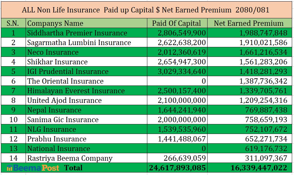 समीक्षा अवधिमा कम्पनीहरुले कुल १६ अर्ब ३३ करोड ९४ लाख रुपैयाँ बराबरको खुद बीमा शुल्क आर्जन गर्न सफल भएका छन् । जसमा सिद्धार्थ प्रिमियर इन्स्योरेन्स अग्रस्थानमा रहेको छ । कम्पनीले यस अवधिमा एक अर्ब ९८ करोड ८७ लाख रुपैयाँ खुेद बीमा शुल्क आर्जन गर्न सफल भएको छ । कम्पनीको चुक्ता पूँजी दुई अर्ब ८० करोड ६५ लाख रुपैयाँ रहेको छ ।