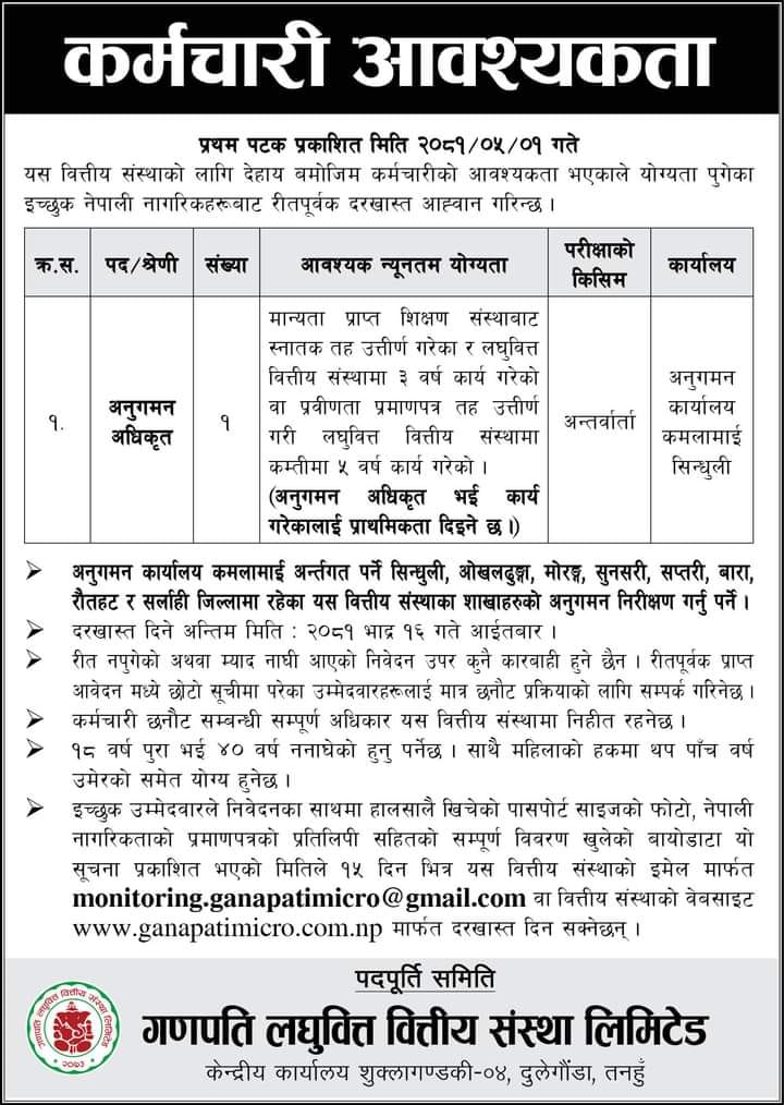 काठमाडौँ । गणपति लघुवित्त वित्तीय संस्था लिमिटेडले अनुगमन अधिकृतमा एक जना कर्मचारी माग गरेको छ । कम्पनीले भदौ १ गते एक सूचना प्रकाशित गर्दै उक्त पदमा कर्मचारी माग गरेको हो ।