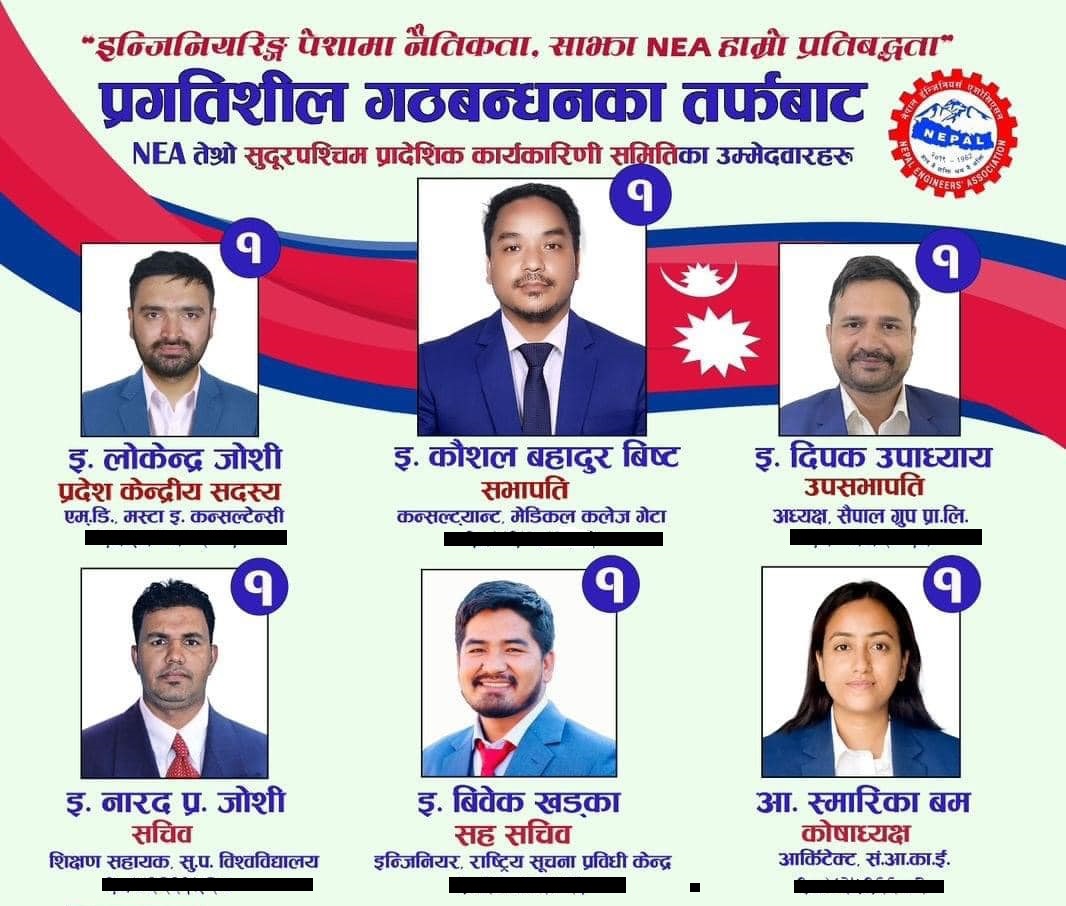 काठमाडौँ । इन्जिनियरहरुको छाता संगठन नेपाल इन्जिनियर्स एशोसिएशन (एनईए) का लागि प्रगतिशील गठबन्धनका तर्फबाट सुदूरपश्चिम प्रदेश तेस्रो कार्यकारिणी समितिमा ई. कौशिल विष्टको नेतृत्वमा उम्मेदवार टुंगो लागेको छ ।