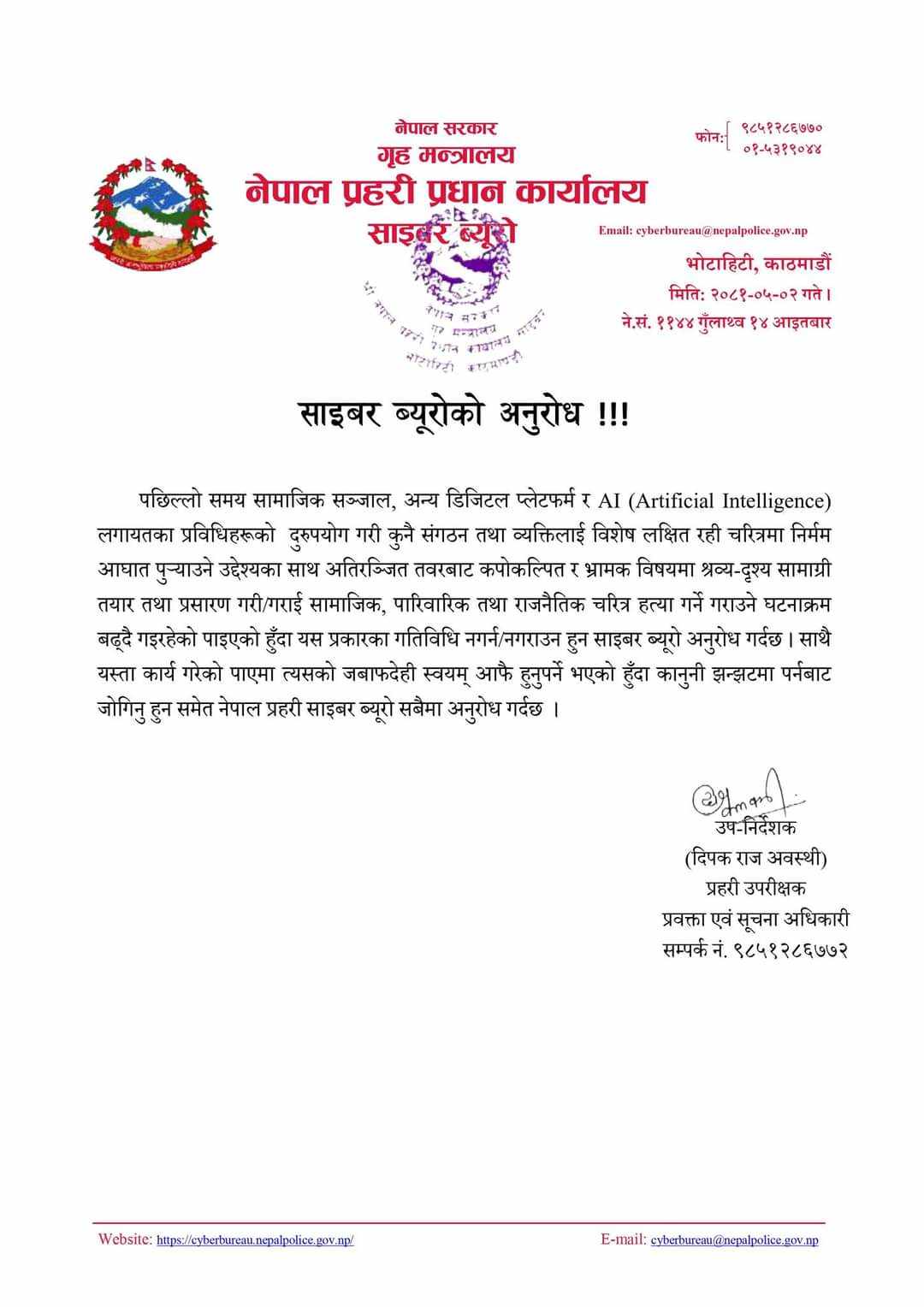 पछिल्लो समय सामाजिक सञ्जाल, अन्य डिजिटल प्लेटफर्म र एआईलगायतका प्रविधिहरूको दुरुपयोग गरी कुनै संगठन तथा व्यक्तिलाई विशेष लक्षित रही चरित्रमा निर्म आघात पुराउने उद्देश्यका कार्य गर्नेहरु बढ्दो क्रममा रहेको ब्यूरोले जारी गरेको सूचना भनेको छ । अतिरञ्जित तवरबाट कपोकल्पित र भ्रामक विषयमा श्रव्य–दृश्य सामाग्री तयार तथा प्रसारण गरी रहेको पाएको प्रहरी उपरीक्षक प्रवक्ता एवं सूचना अधिकारी दिपक राज अवस्थीले बताए ।
