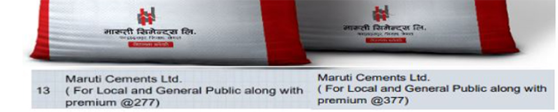त्यस्तै कम्पनी हो मारुती सिमेन्ट । घाटा निरन्तर चुलिदै गएको मारुतीले प्रिमियममा आइपीओ निष्कासन गर्नेका लागि नेपाल धितोपत्र बोर्डमा आवेदन दिइ सकेको छ । पछिल्लो समय व्यापार निरन्तर ओरालो लागि रहेको मारुतीले १०० रुपैयाँ अङ्कित मूल्यमा २७७ रुपैयाँ प्रिमियम थपेर प्रति कित्ता ३७७ रुपैयाँमा शेयर निष्कासन गर्न अनुमति माग गरेको छ । कम्पनीले आयोजना प्रभावित स्थानीय र सर्वसाधारणलाई गरी कुल १ करोड १६ लाख कित्ता बराबरको कुल ३ अर्ब २१ करोड ३२ लाख रुपैयाँको आइपिओ निष्कासनको गर्ने जनाएको छ ।