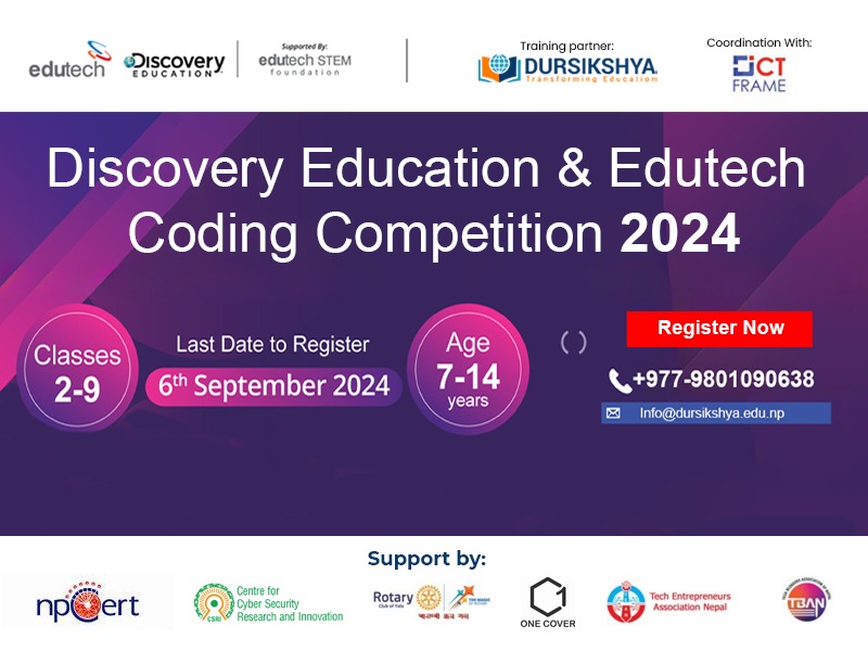 काठमाडौं । डिस्कभरी एजुकेसन नेटवर्क यूके र एडुटेकको सहयोगमा नेपालमा पनि बालबालिकाका लागि राष्ट्रियस्तरको कोडिङ कम्पिटिसन ‘Discovery Education, Edutech Coding Competition 2024’ हुने भएको छ । यो कोडिङ कम्पिटिसनका लागि नेपालको ट्रेनिङ पार्टनरमा आईटी ट्रेनिङ प्रोभाइडर दूरशिक्षा रहेको छ ।