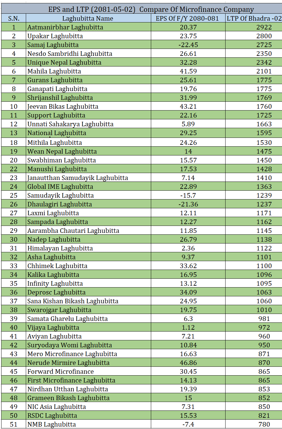 शेयरमूल्यको आधारमा आत्मनिर्भर लघुवित्त अग्रस्थानमा रहेको छ । कम्पनीको प्रतिशेयर आम्दानी २० रुपैयाँ ३७ पैसा भएपनि शेयरमूल्य २९२२ रुपैयाँ रहेको छ । त्यस्तै, प्रतिशेयर आम्दानीमा ऋणात्मक रहेको समजा लघुवित्तको शेयरमूल्य २८०० रुपैयाँसहित दोस्रो स्थानमा रहेको छ ।