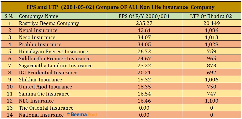 निर्जीवन बीमा कम्पनीमा पनि प्रतिशेयर आम्दानी र कम्पनीहरुको शेयरमूल्यबीच सन्तुलन कायम रहेको छ । सरकारी स्वामित्व रहेको राष्ट्रिय बीमा कम्पनीको प्रतिशेयर आम्दानी २३५ रुपैयाँ २७ पैसा रहेको छ भने शेयरमूल्य २० हजार ४४९ रुपैयाँ रहेको छ ।
