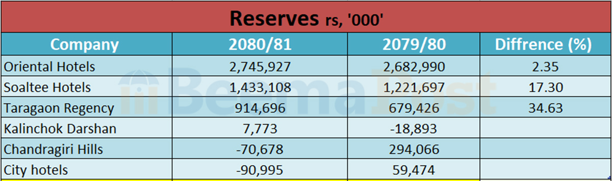 यता, सोल्टी होटलको १ अर्ब ४३ करोड ३१ लाख रुपैयाँ र तारागाँउको ९१ करोड ४६ लाख रुपैयाँ जगेडा कोष रहेको छ । जगेडा कोषमा चन्द्रागिरी र सिटी होटल ऋणात्मक छन् । उक्त कोषमा चन्द्रागिरी हिल्स ७ करोड ६ लाख र सिटि होटल ९ करोड ९ लाख रुपैयाँ नोक्सानमा रहेका छन् ।