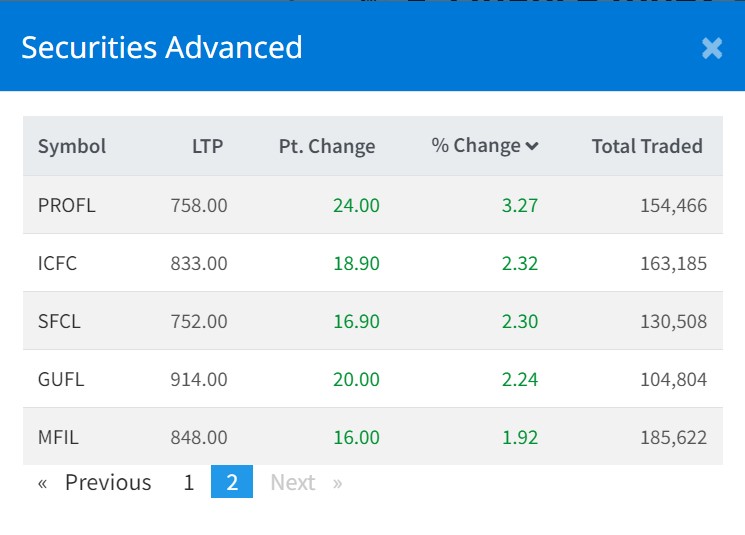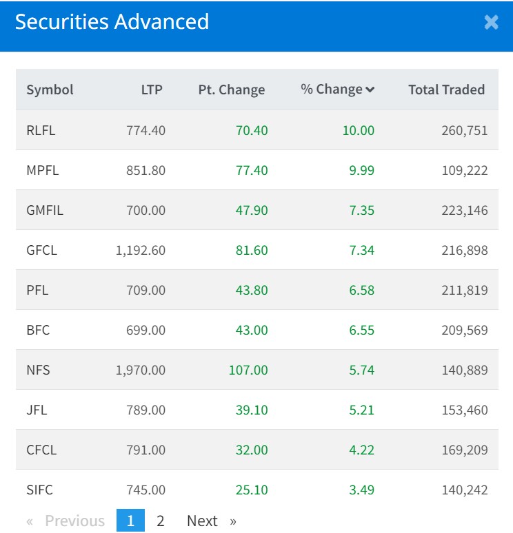 बुधबार मल्टिप्रपोज फाइनान्सको ९.९९ प्रतिशत, गुहेश्वरी मर्चेन्टको ७.३५ प्रतिशत, गूडविल फाइनान्सको ७.३४ प्रतिशत, पोखरा फाइनान्सको ६.५८ प्रतिशत, बेस्ट फाइनान्सको ६.५५ प्रतिशतले वृद्धि भएको छ ।