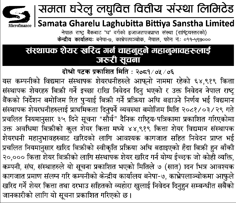 काठमाडौं । समता घरेलु लघुवित्त वित्तीय संस्था लिमिटेडले संस्थापक शेयर बिक्रीमा राखेको छ । कम्पनीले संस्थापक शेयरधनीहरूको नाममा रहेको २० हजार कित्ता शेयर बिक्रीमा राखेको हो ।