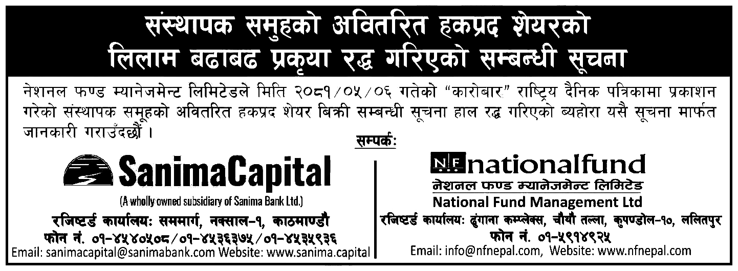 काठमाडौं । नेशनल फण्ड म्यानेजमेन्ट लिमिटेडले अवितरित हकप्रद शेयरको बिक्री प्रक्रिया रद्द गरेको छ । कम्पनीले भदौ १३ गतेदेखि २० गतेसम्म लिलामी प्रक्रियाद्वारा बिक्री गर्ने भनेको ११ लाख ७२ हजार कित्ता शेयरको बिक्री प्रक्रिया रद्द गरेको हो । कम्पनीले भदौ ६ गते उक्त शेयर बिक्रीका लागि सूचना जारी गरेको थियो ।