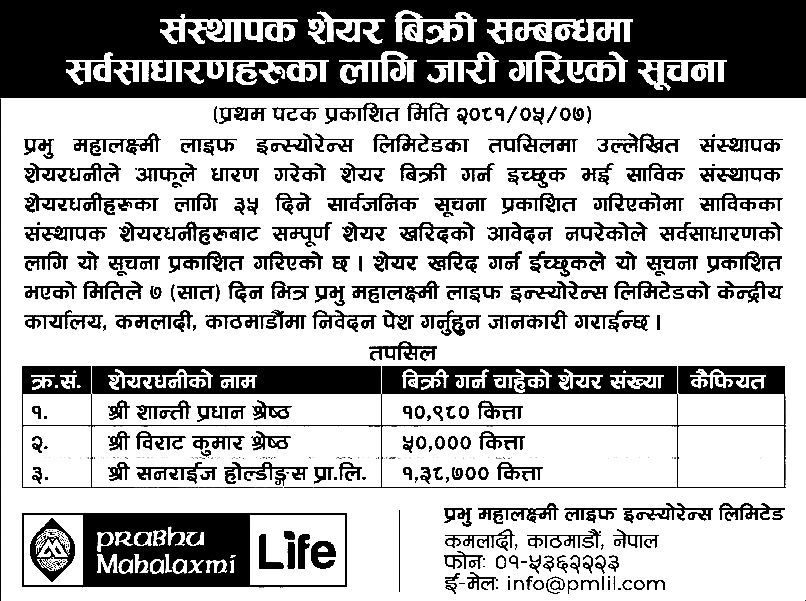 काठमाडौं । प्रभु महालक्ष्मी लाइफ इन्स्योरेन्स लिमिटेडले संस्थापक शेयर बिक्रीमा राखेको छ । कम्पनीले तीन जना संस्थापक शेयरधनीहरूको नाममा रहेको १ लाख ९९ हजार ६८० कित्ता शेयर बिक्रीमा राखेको हो ।