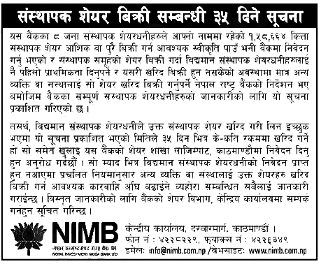 काठमाडौं । नेपाल इन्भेष्टमेन्ट मेगा बैंक लिमिटेडले संस्थापक शेयर बिक्रीमा राखेको छ । बैंकले ८ जना संस्थापक शेयरधनीहरूको नाममा रहेको १ लाख ५८ हजार ६६४ कित्ता शेयर बिक्रीमा राखेको हो ।