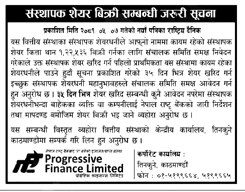 प्रोगेशिभ फाइनान्सको १ लाख २२ हजार कित्ता शेयर बिक्रीमा