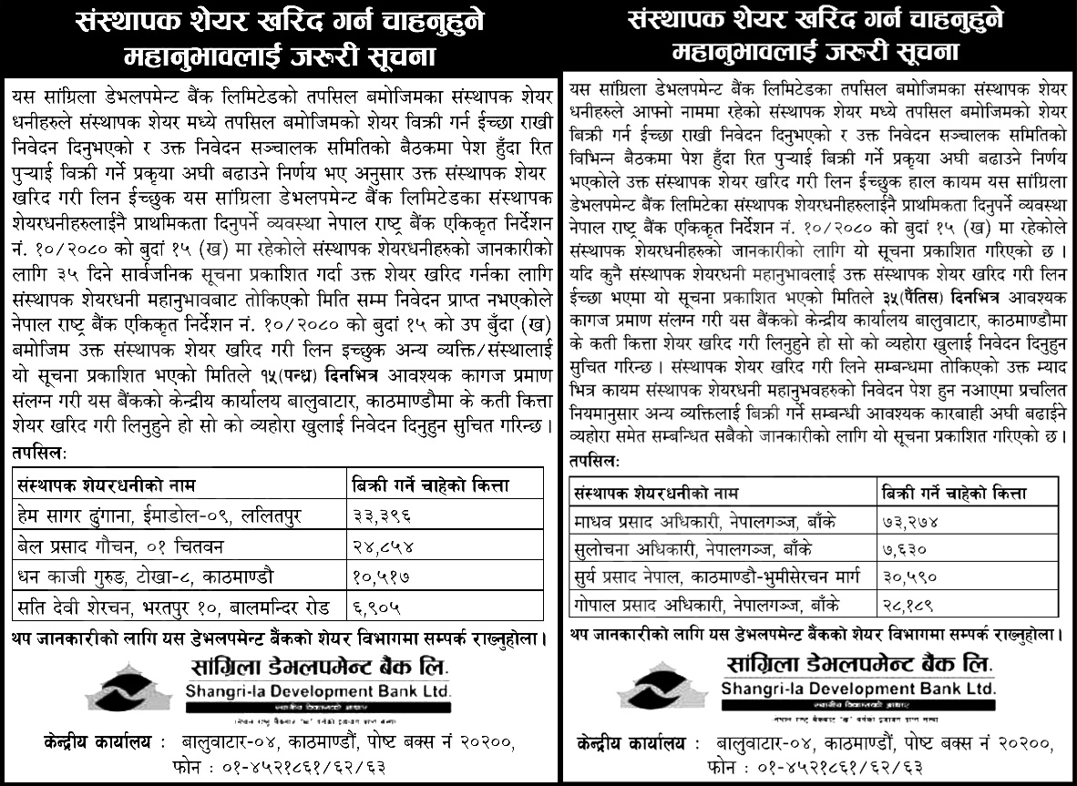 काठमाडौं । सांग्रिला डेभलपमेन्ट बैंक लिमिटेडले संस्थापक शेयर बिक्रीमा राखेको छ । बैंकले ८ जना संस्थापक शेयरधनीहरूको नाममा रहेको कूल २ लाख १५ हजार ३५५ कित्ता शेयर बिक्रीमा राखेको हो ।