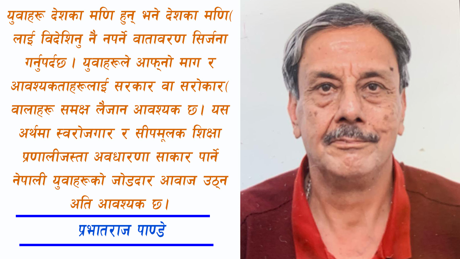 दिनहुँ बाकसमा बन्द भएर आउने नेपाली युवाहरूको शवहरू अनि तिनका आश्रित परिवारका आँसुबारे सोच्न ढिला भएको छ । युवाहरू देशका मणि हुन् भने देशका मणिलाई विदेशिनु नै नपर्ने वातावरण सिर्जना गर्नुपर्दछ । युवाहरूले आफ्नो माग र आवश्यकताहरूलाई सरकार वा सरोकारवालाहरू समक्ष लैजान आवश्यक छ । यस अर्थमा स्वरोजगार र सीपमूलक शिक्षा प्रणालीजस्ता अवधारणा साकार पार्ने नेपाली युवाहरूको जोडदार आवाज उठ्न अति आवश्यक छ । यो समस्या समाधानको लागि देशको सार्वजनिक प्रशासन र भौतिक पूर्वाधार निर्माणमा हुने निहित स्वार्थ हटाउन अति आवश्यक छ ।