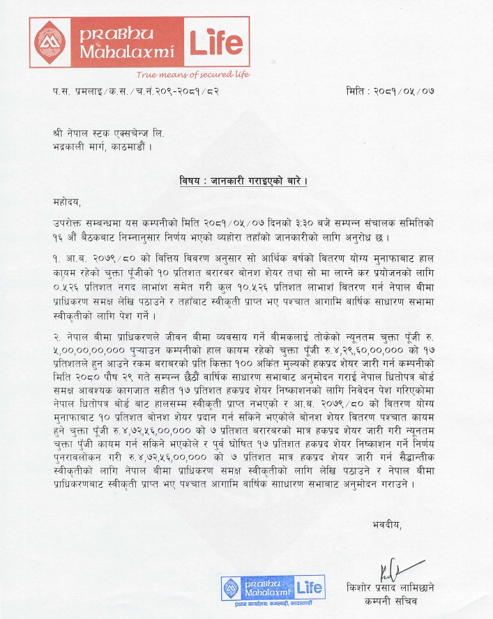 प्रभु महालक्ष्मी लाइफले १०.५२६% लाभांश वितरण र ७% हकप्रद जारी गर्ने