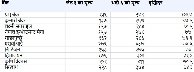 प्रभुपछि कुमारी, लक्ष्मी सनराइज, नेपाल इन्भेस्टमेन्ट मेगा, माछापुच्छ्रे, नेपाल एसबीआई, सिटिजन्स, हिमालयन, कृषि विकास र सिद्धार्थ बैंक मूल्य धेरै बढ्नेमा टप १० भित्र पर्छन् । यी सबैको मूल्य तीन महिनामा समूहको औसत वृद्धि ९६२।८ प्रतिशतभन्दा० धेरै बढेको छ ।