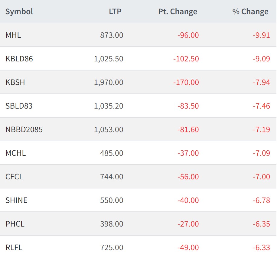 आज मन्दाकिनी हाइड्रोपावर, १०.२५% केबिएल डिबेन्चर २०८६, कुथेली बुखरी स्मल हाइड्रोपावर, १०.२५% एसबिएल डिबेन्चर २०८३, १०.२५% एनबिबिएल डिबेन्चर २०८५, मेन्छियाम हाइड्रोपावर, सेन्ट्रल फाइनान्स, शाइन रेसुङ्गा डेभलपमेन्ट बैंक, पिपुल्स हाइड्रोपावर र रिलायन्स फाइनान्सको सर्वाधिक शेयरमूल्य घटेको छ ।