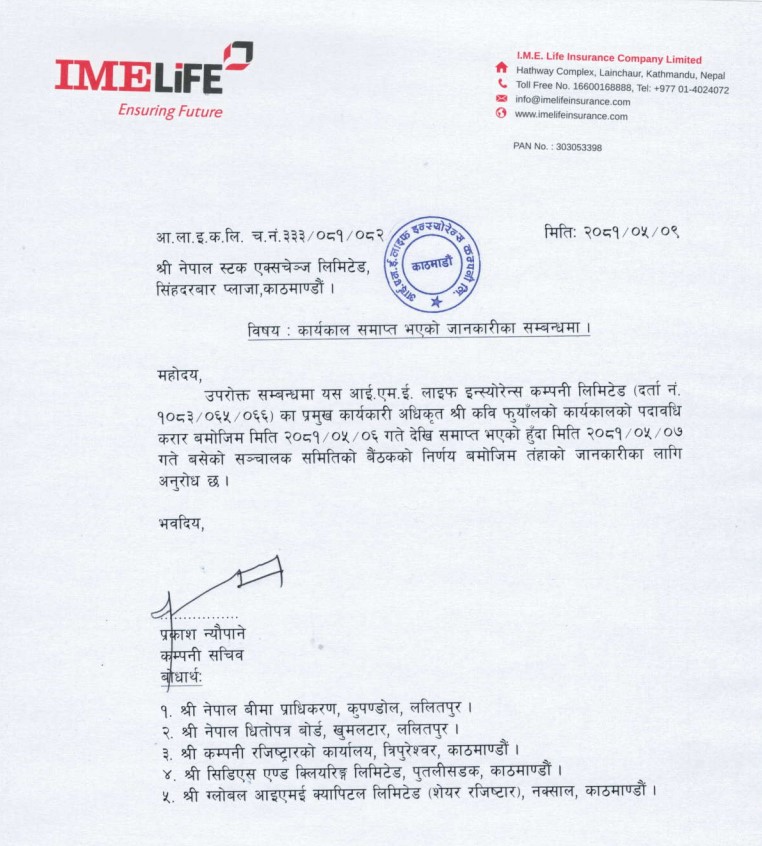 कम्पनीले नेप्सेलाई पठाएको पत्रमा भने कार्यकाल समाप्त भएको जानकारी दिइएको उल्लेख छ । उनको कार्यकाल यही भदौं ६ गते सकिएको थियो । बीमा प्राधिकरणबाट नविकरण गरेर ल्याइसकिएको अवस्थामा नयाँ प्रक्रिया अघि नबढाउन दुवै पक्ष सहमत भई पदावधी समाप्त गर्ने निर्णय भएको छ ।