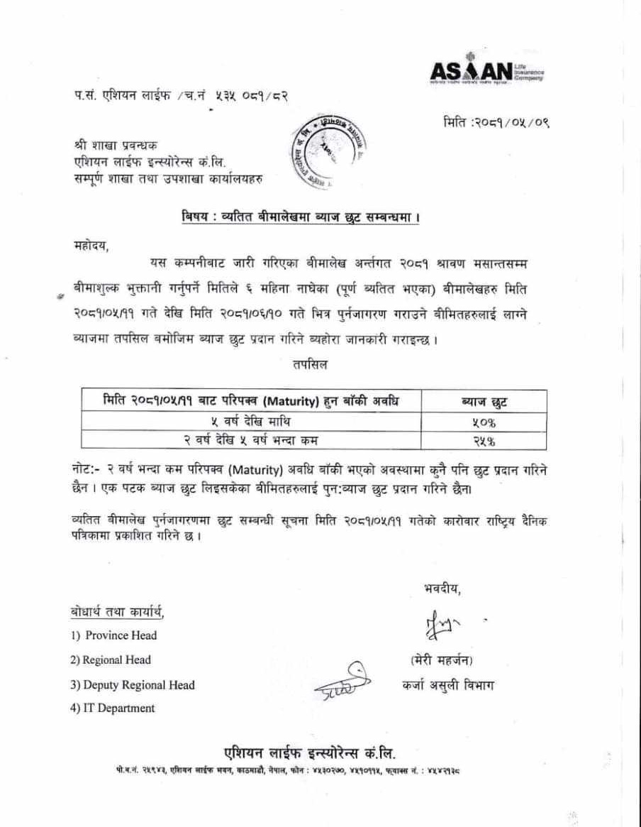 काठमाडौं । एशियन लाइफ इन्स्योरेन्स कम्पनीले व्यतित बीमालेख नवीकरण गर्दा ५० प्रतिशतसम्म ब्याज छुट दिने निर्णय गरेको छ ।