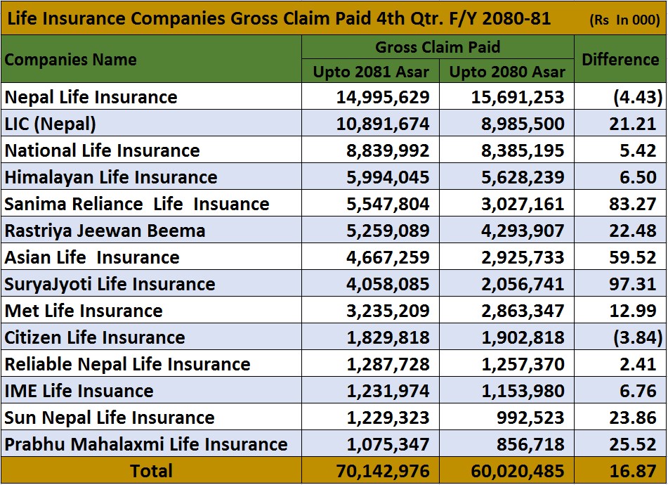 यता मेट लाइफले रू. ३ अर्ब २३ करोड, सिटिजन लाइफले रू. १ अर्ब ८२ करोड, रिलायबल नेपाल लाइफले रू. १ अर्ब २८ करोड, आईएमई लाइफले रू. १ अर्ब २३ करोड, सन नेपाल लाइफले रू. १ अर्ब २२ करोड र प्रभु महालक्ष्मी लाइफले रू १ अर्ब ७ करोडबढीको कुल दाबी भुक्तानी गरेको छ ।