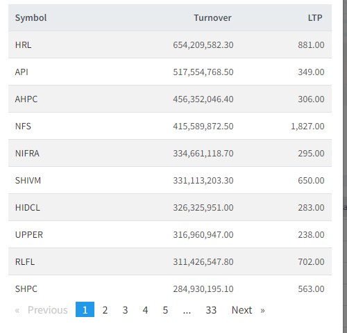 त्यस्तै, अपी पावर, अरुण भ्याली, नेपाल फाइनान्स, निफ्रा, शिवम सिमेन्टस, हाईड्रोइलेक्टिसिटि इन्भेष्टमेन्ट, रिलायन्स फाइनान्स र सानिमा माईको सर्वाधिक कारोबार भएको छ।