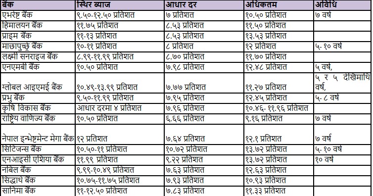 बैंकरहरू भने ब्याजदर परिवर्तन नहुने कर्जा लिन सुझाउँछन्। ब्याजदर परिवर्तन नहुने कर्जाको अवधि लामो हुन्छ।