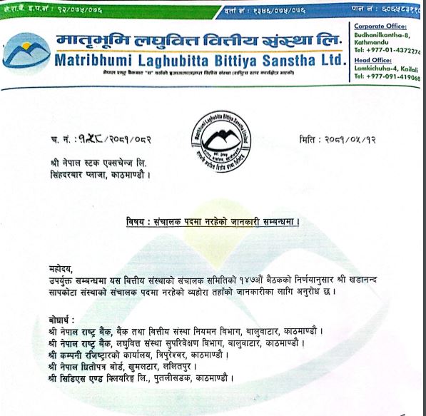 काठमाडौँ । मातृभूमि लघुवित्त वित्तीय संस्थाले संचालक खडानन्द सापकोटा पदमुक्त भएका छन्। कम्पनीको संचालक समितिको १४७औं बैठकले सापकोटालाई संचालक पदबाट हटाउने निर्णय गरेको छ ।