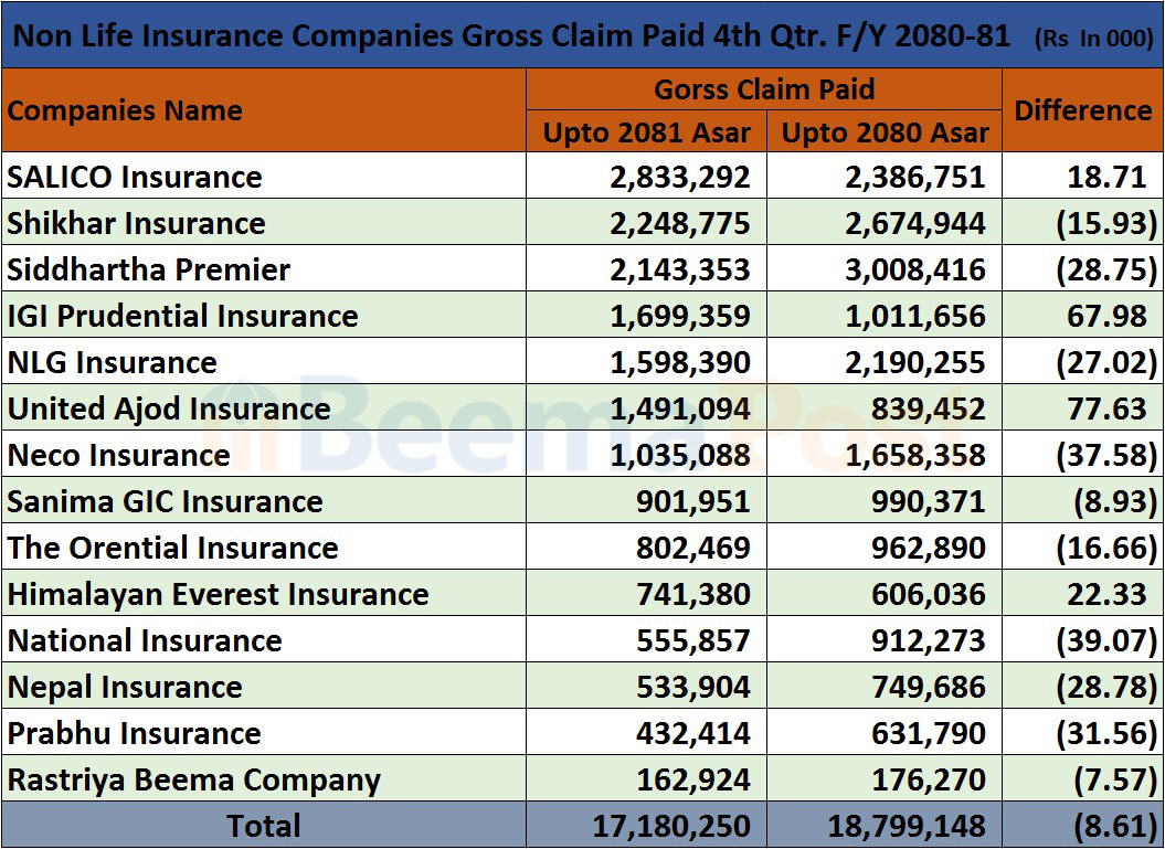 यता एनएलजी इन्स्योरेन्सले रू. १ अर्ब ५९ करोड, यूनाईटेड अजोडले रू. १ अर्ब ४९ करोड, नेकोले रू. १ अर्ब ३ करोड, सानिमा जिआईसीले रू. ९० करोड र दि ओरियन्टलले रू. ८० करोड माथिको दाबी भुक्तानी गरेको छ ।