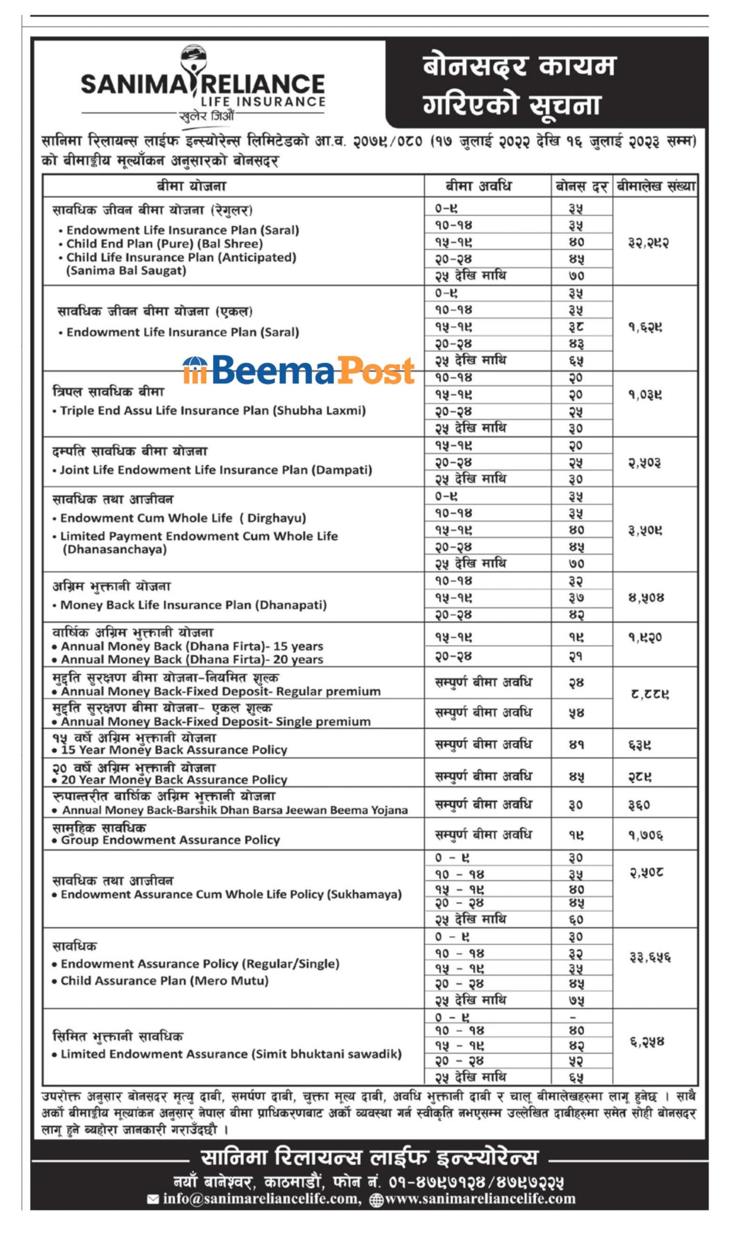 सानिमा रिलायन्सले आव २०७९।८० मा आधारित बोनसदर गत साता बीमा प्राधिकरणबाट स्वीकृत प्राप्त गरेको थियो । स्वीकृत बोनसदर अनुसार सावधिक जीवन बीमामा न्यूनतम् ३५ रुपैयाँदेखि अधिकतम् ७० रुपैयाँ प्रतिवर्ष प्रति हजारका दरले बीमितले बोनस पाउनेछन् ।