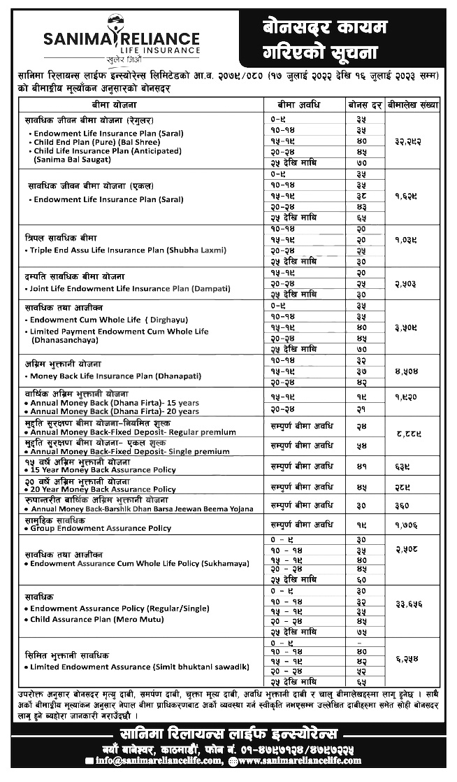 सानिमा रिलायन्स लाइफको बोनसदर सार्वजनिक, अधिकतम ७५ रुपैयाँसम्म बोनस पाइँने