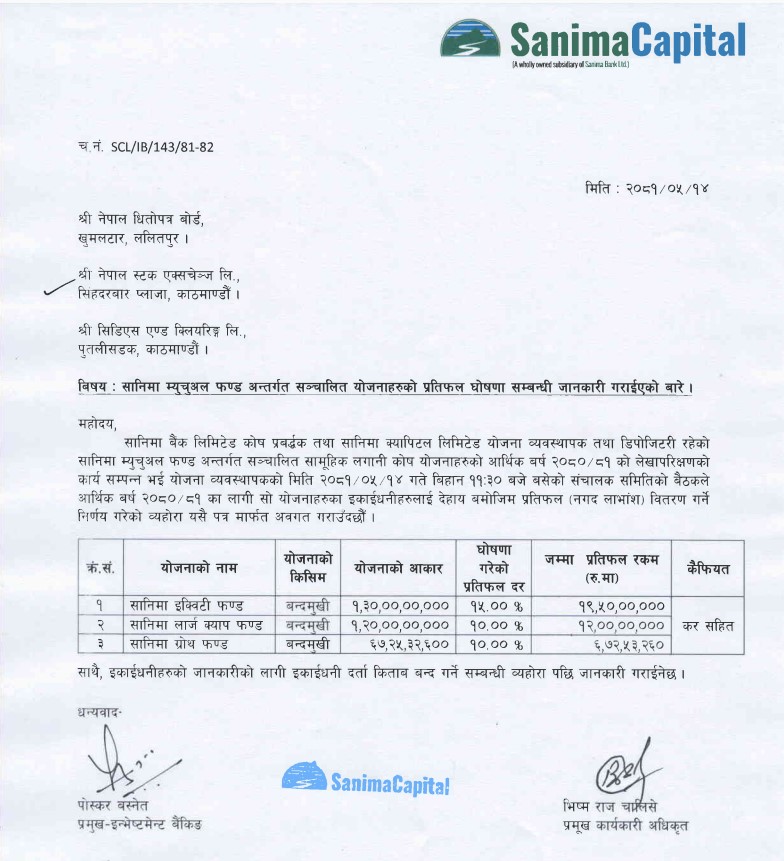 क्यापिटलको भदौ १४ गते बसेको सञ्चालक समिति बैठकले गत वर्षको नाफाबाट सानिमा इक्विटी फन्डका इकाईधनीहरुलाई कर सहित १५ प्रतिशत, सानिमा लार्ज क्याप फन्डका इकाईधनीहरुलाई कर सहित १० प्रतिशत र सानिमा ग्रोथ फन्डका इकाईधनीलाई कर सहित १० प्रतिशत प्रतिफल (नगद लाभांश) वितरण गर्ने निर्णय गरेको हो ।