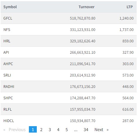 त्यस्तै, हिमालयन रि, अपी पावर, सानिमा रिलायन्स, अरुण भ्याली, सानिमा माई, रादी पावर, रिलायन्स फाइनान्स र हाईड्रोइलेक्टिक इन्भेष्टमेन्टको सर्वाधिक कारोबार भएको छ।