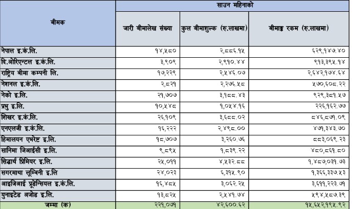 बीमा प्राधिकरणको तथ्यांक अनुसार हिमालयन एभरेष्टले ३२ करोड ६० लाख, नेको इन्स्योरेन्सले ३१ करोड ८८ लाख रुपैयाँ,आइजिआई प्रुडेन्सियलले ३० करोड ६२ लाख, ओरिएण्टल इन्स्योरेन्सले २९ करोड १० लाख,नेपाल इन्स्योरेन्सले २८ करोड ८६ लाख, सरकारी स्वामित्वमा रहेको कम्पनी राष्ट्रिय बीमा कम्पनीले २५ करोड ४६ लाख रुपैयाँ कुल बीमाशुल्क आर्जन गर्न सफm भएका छन् ।