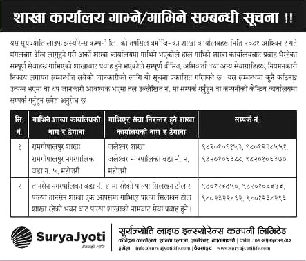 यी गाभिएर बनेको शाखाबाट कम्पनीले असोज १ गतेदेखि सेवा प्रवाह गर्ने जनाएको छ । पछिल्लो समय सूर्यज्योति लाइफले धमाधम शाखा कार्यालयहरू मर्ज गर्दै गइरहेको छ ।