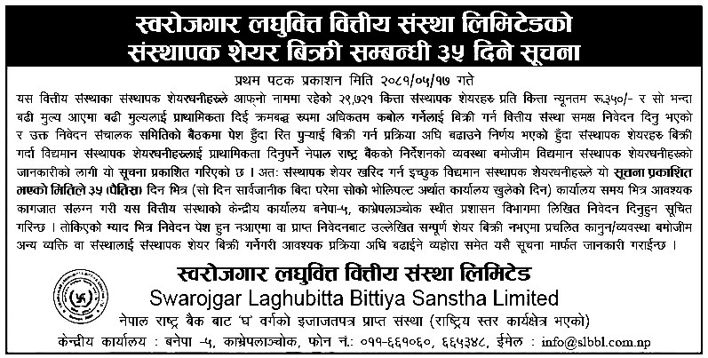 काठमाडौं । स्वरोजगार लघुवित्त वित्तीय संस्था लिमिटेडले संस्थापक शेयर बिक्रीमा राखेको छ । कम्पनीले केही संस्थापक शेयरधनीहरूको नाममा रहेको २९ हजार ७२१ कित्ता संस्थापक शेयर बिक्रीमा राखेको हो ।