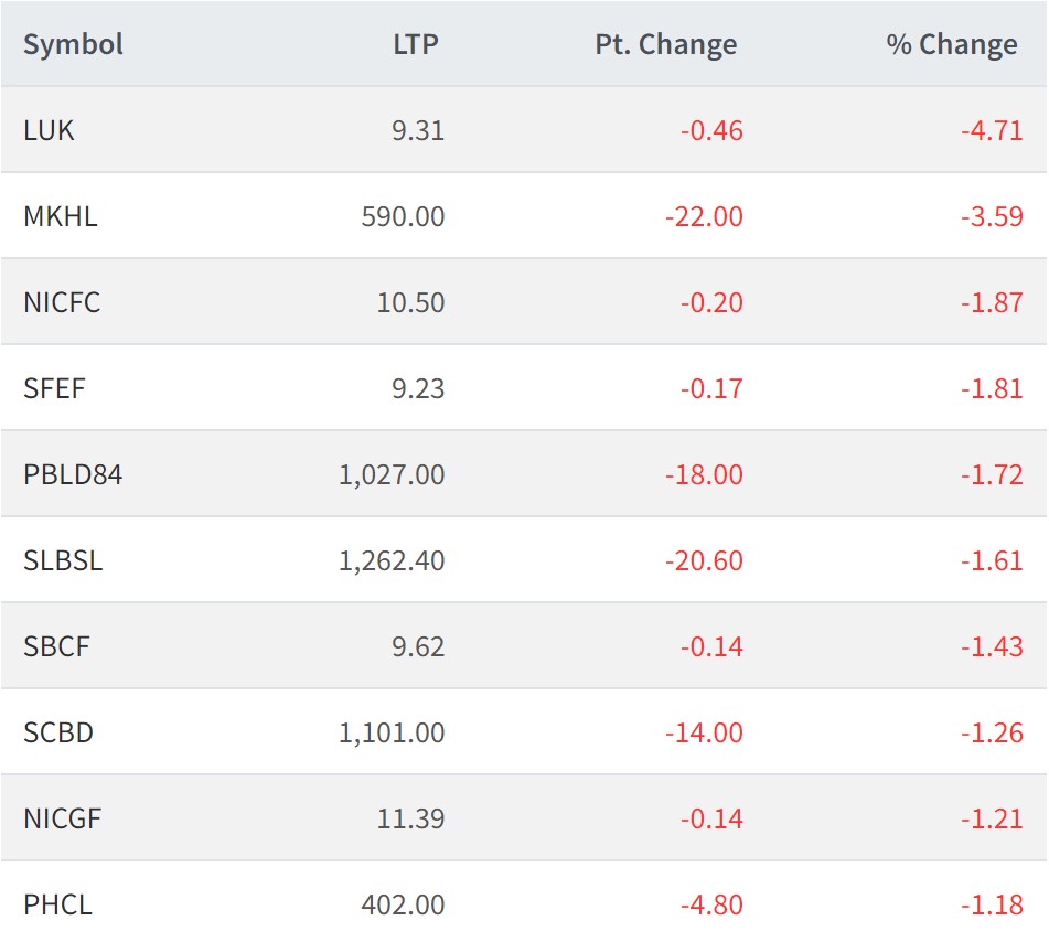 यता लक्ष्मी उन्नती कोष, माई खोला हाइड्रो, एनआईसी एशिया फ्लेक्सी क्याप फण्ड, सनराइज फोकस्ड इक्विटी फण्ड लगायतका कम्पनीहरूको शेयरमुल्य सर्वाधिक घटेको छ ।