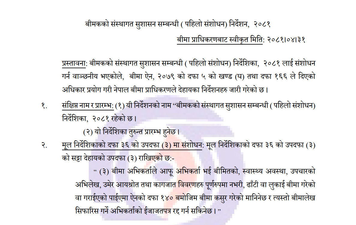 आज सार्वजनिक गरिएको तर पुरानो मिति राखेर पास गरिएको संस्थागत सुशासन सम्बन्धी निर्देशिकाको बुँदा नं ३६ को ३ नम्वर बुँदा संशोधन गर्दै बीमा अभिकर्ताको लाइसेन्स खारेज गर्ने नयाँ व्यवस्था थप गरिएको छ । बीमा अभिकर्ताहरुले बीमा गर्ने क्रममा बीमितको विवरण ढाँटेर भरेको अवस्थामा बीमा अभिकर्ताको लाइसेन्स खारेज गर्ने व्यवस्था राखिएको हो । उक्त व्यवस्था अनुसार बीमितले नै झुठा विवरण दिएमा वा बीमा प्रस्ताव फारम बीमा अभिकर्ताले नभरी बीमक कम्पनीकै कर्मचारीले भरेको अवस्थामा के हुने भन्ने व्यहोरा उल्लेख छैन ।