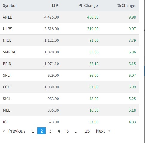 सर्वाधिक कारोबार भएको एनएलजी, सिन्धु विकास बैंक, मातृभूमि लघुवित्त, ग्रिन डेभलपमेन्ट बैंक, विन नेपाल लघुवित्त, मानुषि लघुवित्त, विन्धवासिनी हाईड्रोपावर, इष्र्टन हाईड्रोपावर,सप्तकोशी विकास बैं, कर्पोरेट विकास बैंक र आत्मनिर्भर लघुवित्तको शेयर मूल्य वृद्धि भएको छ।