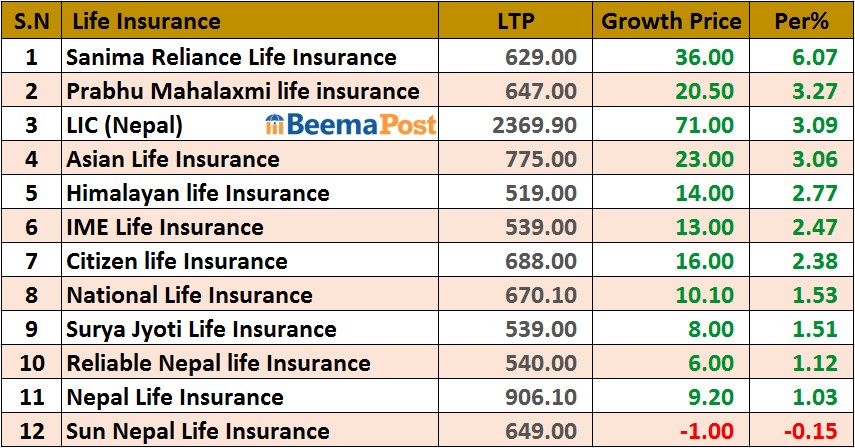 जीवन बीमातर्फ पनि आज ११ वटा कम्पनीको शेयरमूल्य बढेको छ भने सन नेपाल लाइफको ०.१५ प्रतिशतले घटेको छ । आज प्रभु महालक्ष्मी लाइफको सर्वाधिक ३.२७ प्रतिशतले शेयरभाउ बढेको छ ।