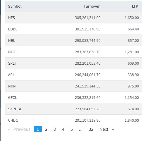 त्यस्तै, एक्सेल डेभलपमेन्ट बैंक, सानिमा रिलायन्स, हिमालयन रि, एनएलजी इन्स्योरेन्स, अपी पावर, एनआरएन इन्फ्रास्टक्चर, सप्तकोशी डेभलपमेन्ट बैंक, गुडबिल फाइनान्स र सिईडिबीको सर्वाधिक कारोबार भएको छ।