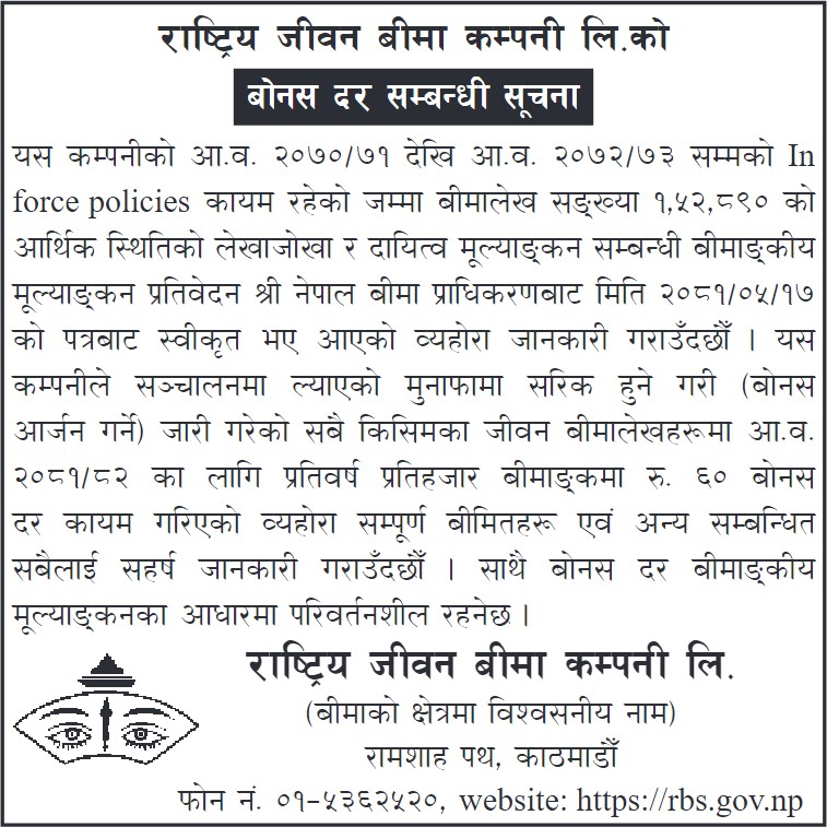 राष्ट्रिय जीवन बीमा कम्पनीको बोनसदर सार्वजनिक, सबै बीमालेखमा ६० रुपैयाँ बोनस दिइने