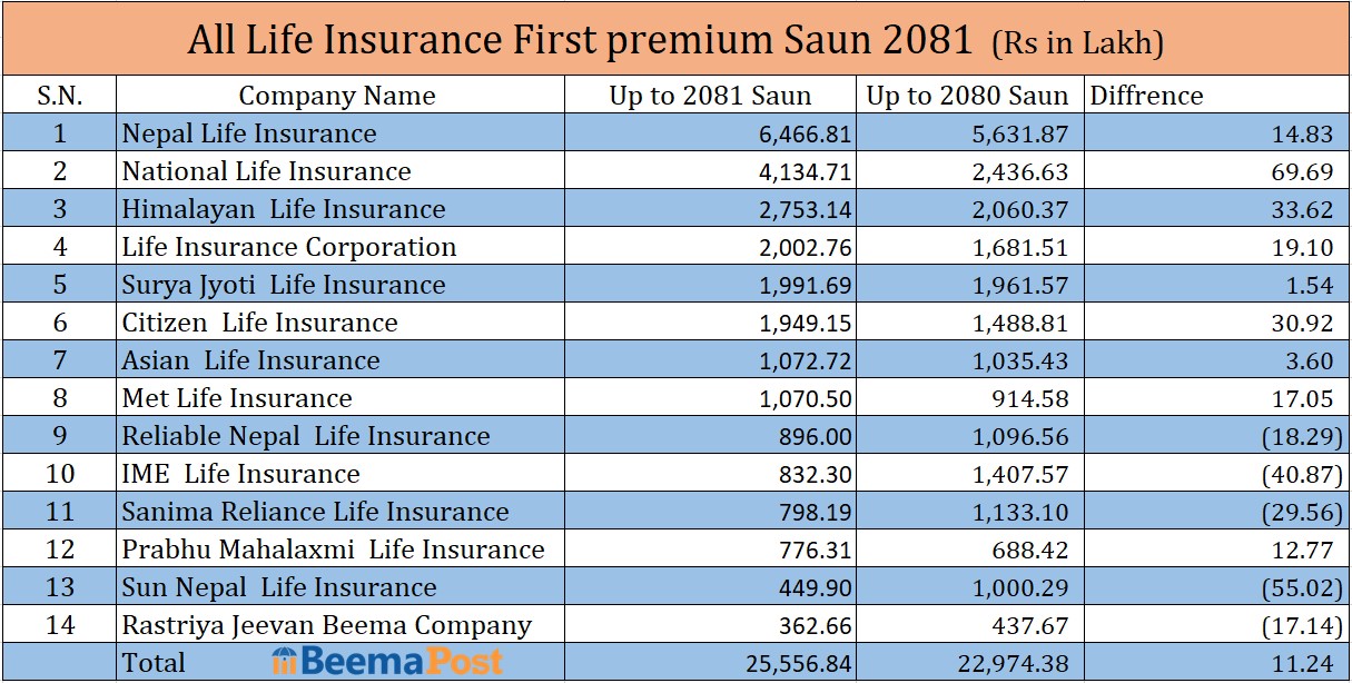नेपाल लाइफको प्रथम बीमा शुल्क १४.८३ प्रतिशतले बृद्धि भई ५६ करोडबाट बढेर ६४ करोड नाघेको छ । त्यस्तै दोस्रोमा नेशनल लाइफ रहेको छ । नेशनल लाइफको प्रथम बीमा शुल्क सर्वाधिक ६९.६९ प्रतिशतले बृद्धि भई २४ करोडबाट बढेर ४१ करोड पुगेको छ ।