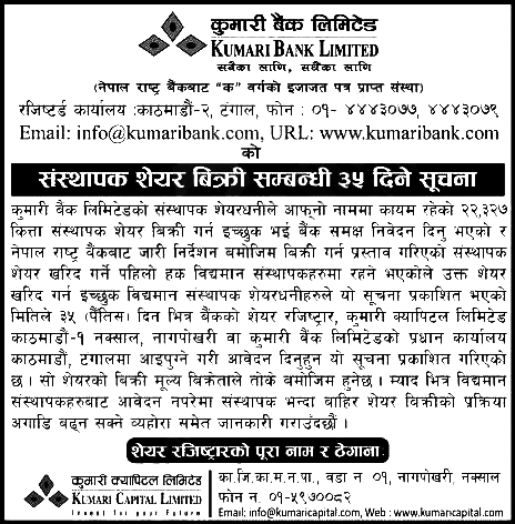 काठमाडौं । कुमारी बैंक लिमिटेडले संस्थापक शेयर बिक्रीमा राखेको छ । बैंकले संस्थापक शेयरधनीको नाममा रहेको २२ हजार ३२७ कित्ता शेयर बिक्रीमा राखेको हो ।